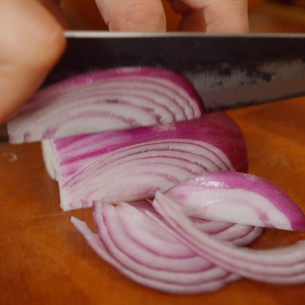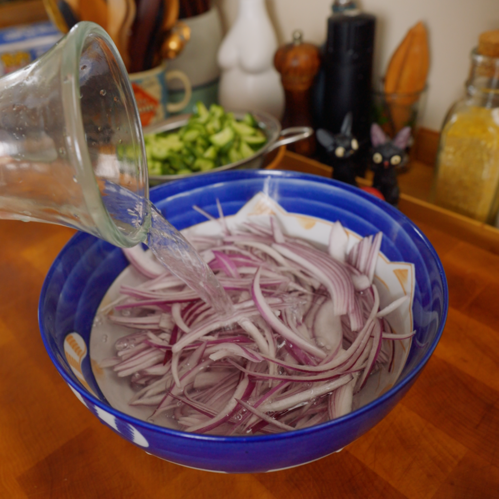 - Soak the red onion. While the water heats, put the sliced red onion in a bowl and cover with hot (not boiling) water. Let it sit for 10 minutes. Drain well right before you build the salad.