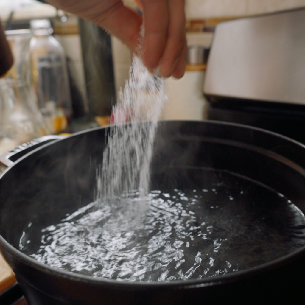 - Bring a large pot of water to a roaring boil and salt it generously (about 1 to 2 tablespoons per 4 cups water).