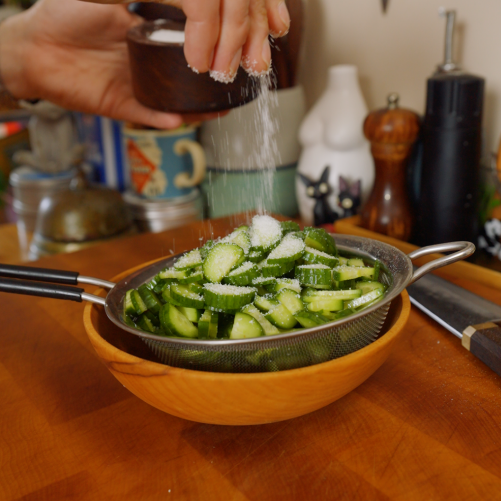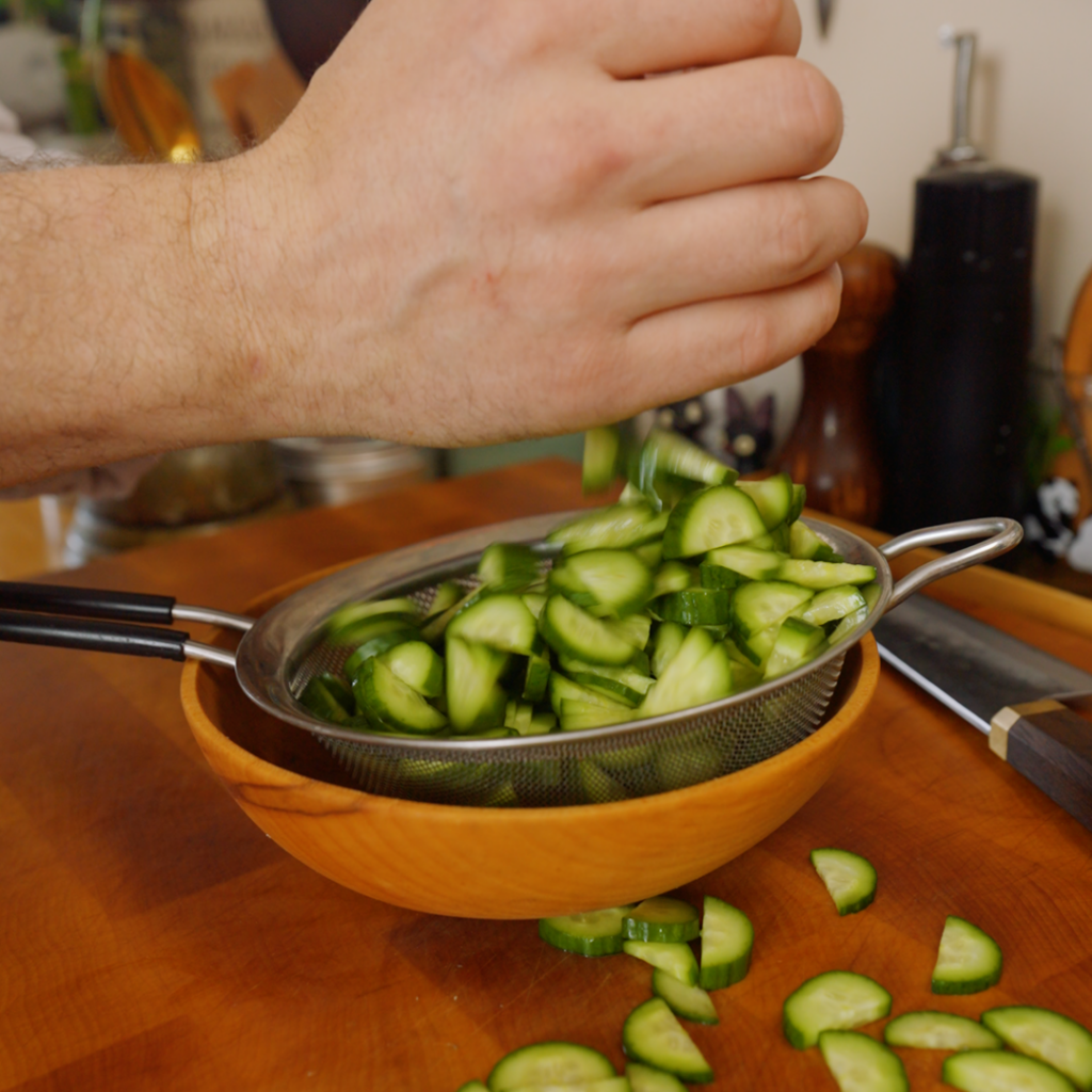 - Salt the cucumbers. Add the sliced cucumbers to a fine-mesh strainer set over a bowl. Season with a big pinch of salt, toss, and let them drain while you do everything else. Before assembling: gently squeeze excess liquid or pat the cucumbers dry.