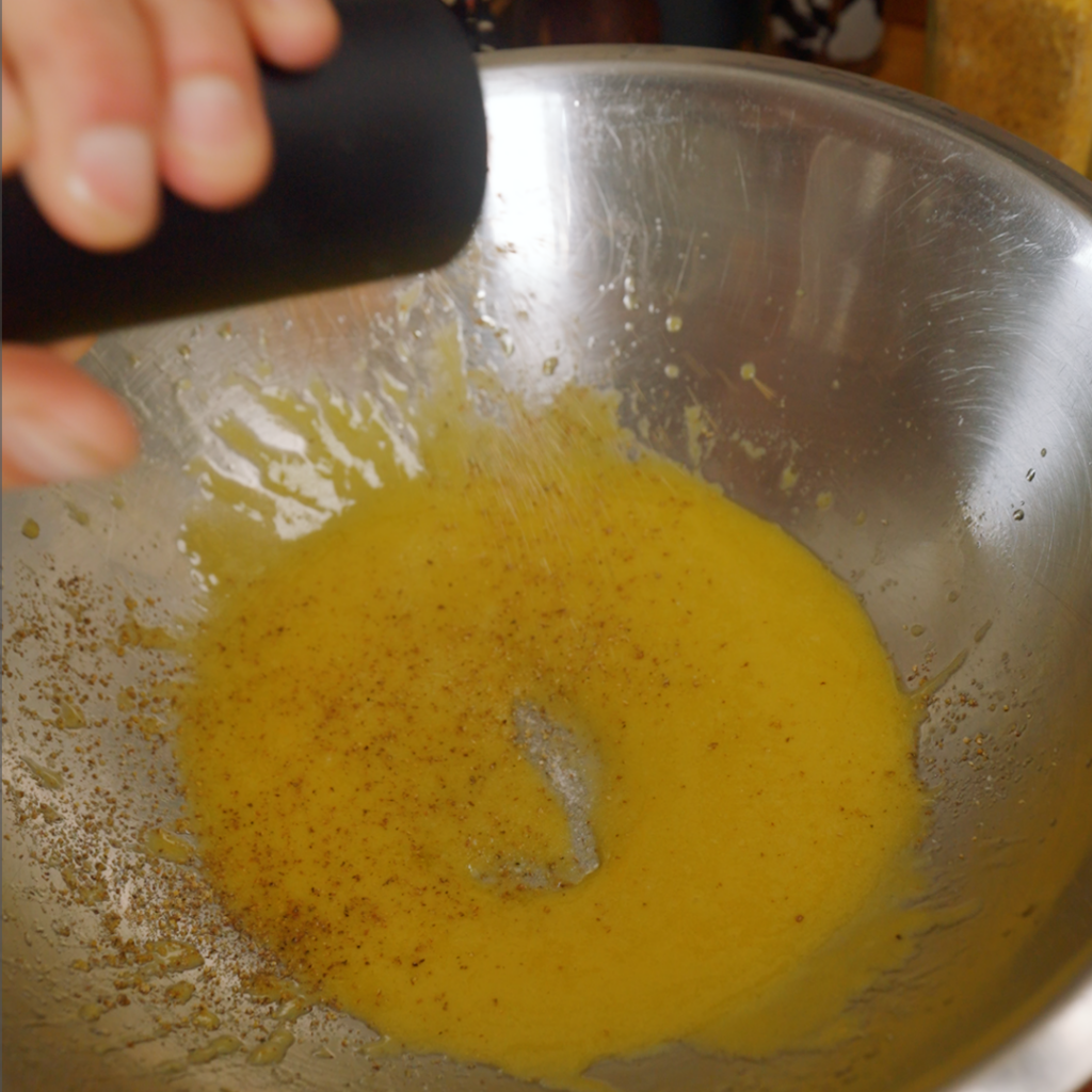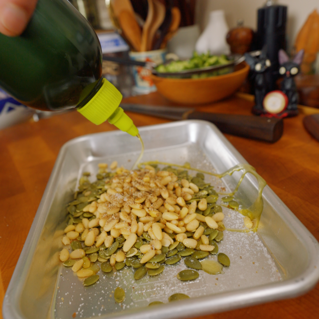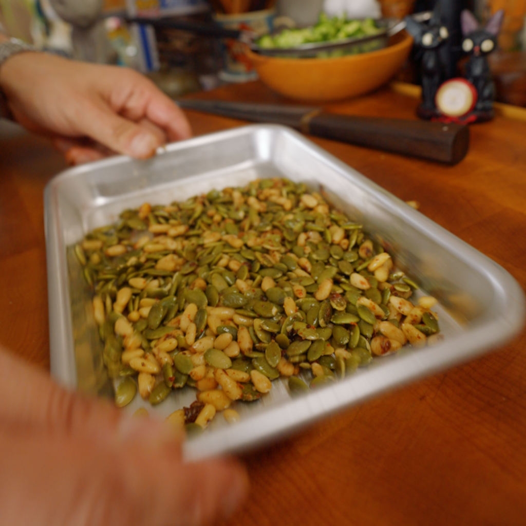 - Toast the nuts + seeds. Heat the oven to 400°F. On a small sheet tray, toss pumpkin seeds and pine nuts with cumin, Aleppo, salt, pepper, and a tiny drizzle of olive oil — just enough to lightly coat. Spread in an even layer and roast for 8–10 minutes, stirring halfway through, until fragrant and the pine nuts are lightly golden.