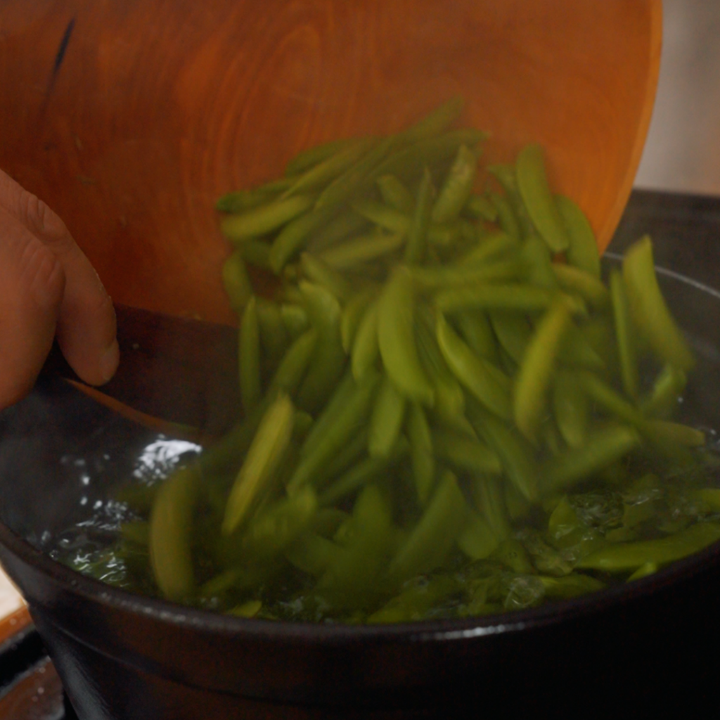 - Blanch the snap peas. Drop the snap peas into the boiling water and blanch for about 60 seconds, just until they turn electric green and are crisp-tender. Using a spider or fine-mesh strainer, scoop them straight into the ice bath to stop the cooking. Once fully cool, drain and dry them well.