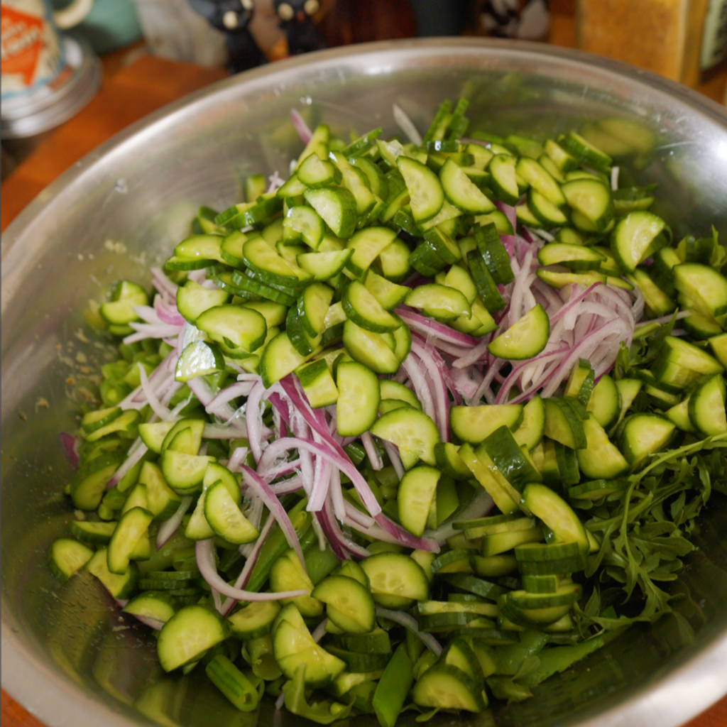 This one is different because it treats each ingredient like it deserves a little self-care and attention. The sugar snap peas get a quick blanch and an ice bath so they stay bright, sweet, and snappy—not raw-tough. The cucumbers are salted first to prevent salad soup at the bottom of the bowl. And the red onions take a warm-water soak that softens the bite, keeps that onion-y flavor, and doesn’t leave you with onion breath.