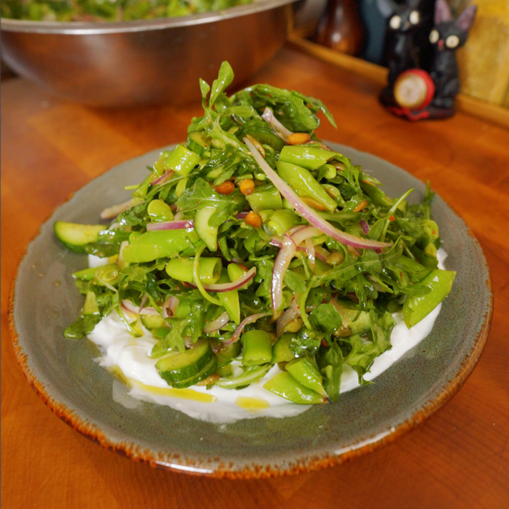Assemble the salad. Chop peas, then toss with arugula, drained cucumbers, drained onions, and most of the toasted nuts/seeds in the dressing; season to taste and save a little crunch for topping.