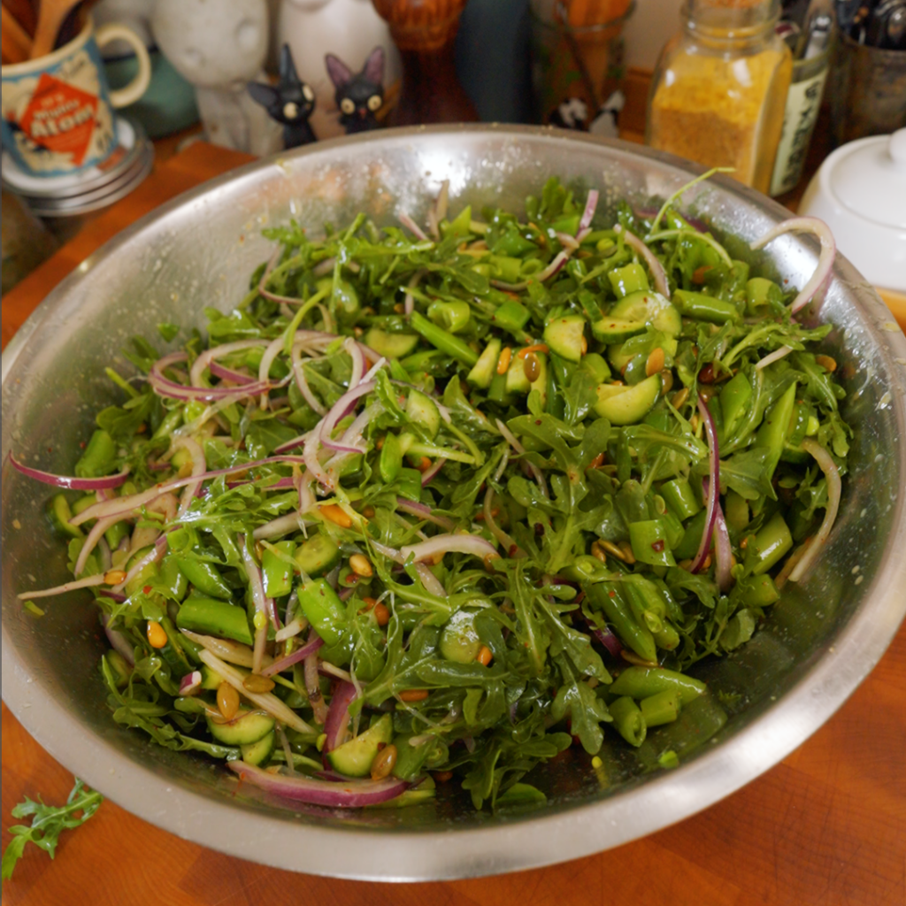 - Assemble the salad. Roughly chop the snap peas. Add peas and arugula to the bowl with the dressing. Add the drained, dried cucumbers, the drained onions, and most of the toasted nuts/seeds (save a little for topping). Toss gently until everything is lightly coated. Taste and adjust with salt, pepper, and lemon as needed. (See Note 1)